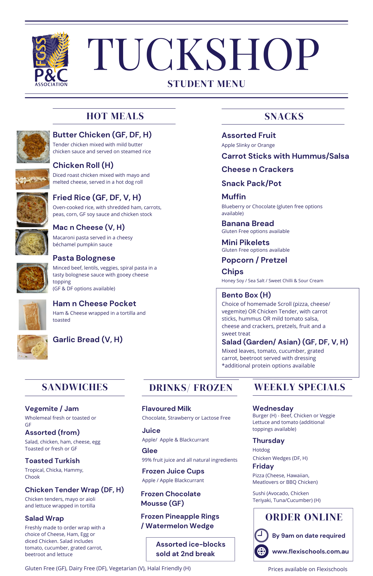 Here is our menu, orders can be placed through our Online Ordering facility, Flexischools.